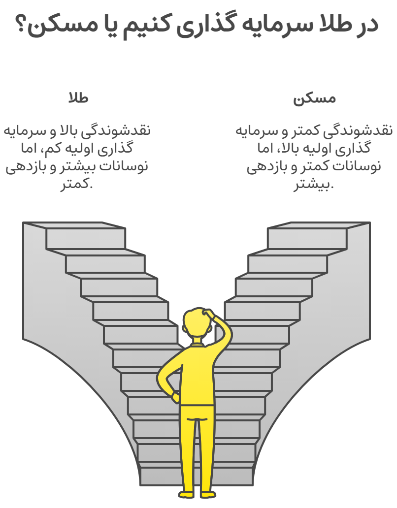 - ریسکپذیری متوسط تا بالا: طلا ممکن است نوسانات زیادی را تجربه کند، بنابراین برای افرادی که توانایی تحمل ریسک بالاتری دارند، مناسبتر است.